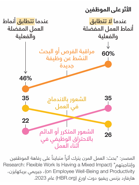 يفضل مَن يفصلون بين العمل والحياة الشخصية الالتزام بجدول عمل من 9 صباحاً إلى 5 مساءً، في حين يفضل مَن يدمجون بينهما التنويع بين العمل والأنشطة الأخرى على مدار اليوم. وأثبتت دراسة استقصائية أجرتها مؤسسة غالوب عام 2023 بمشاركة موظفين أميركيين أن كلتا الفئتين تحقق أداءً أفضل عند تلبية تفضيلاتهم. على سبيل المثال، يسعى 46% فقط من الموظفين الذين تتطابق أنماط عملهم المفضلة مع أنماط عملهم الفعلية إلى البحث عن وظيفة جديدة، مقارنة بـ 60% ممن لا يستطيعون العمل وفق أنماطهم المفضلة.