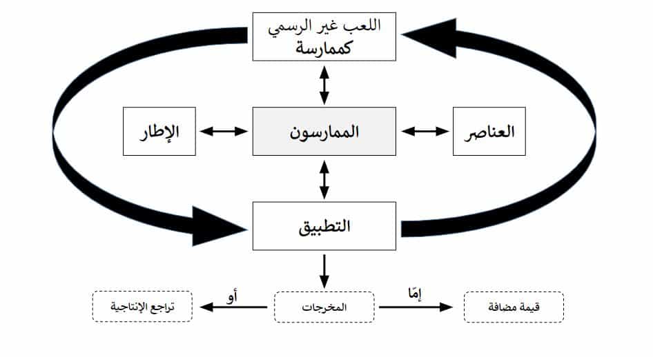 الإطار المقترح: بناء على العناصر الخمسة التي قمنا بتقديمها، نقترح الإطار المدرج أدناه للمساعدة على ترسيخ اللعب غير الرسمي كممارسة واقعية داخل المؤسسات، وذلك بالاعتماد على التفاعل بين هذه العناصر لتحسين الأداء وبالتالي القيمة التي تقدمها المؤسسات، أو على العكس يمكن أن تؤدي هذه الممارسة إلى تشجيع الموظفين على تحدي الأنظمة الإدارية ما يقود إلى تخفيض الإنتاجية.