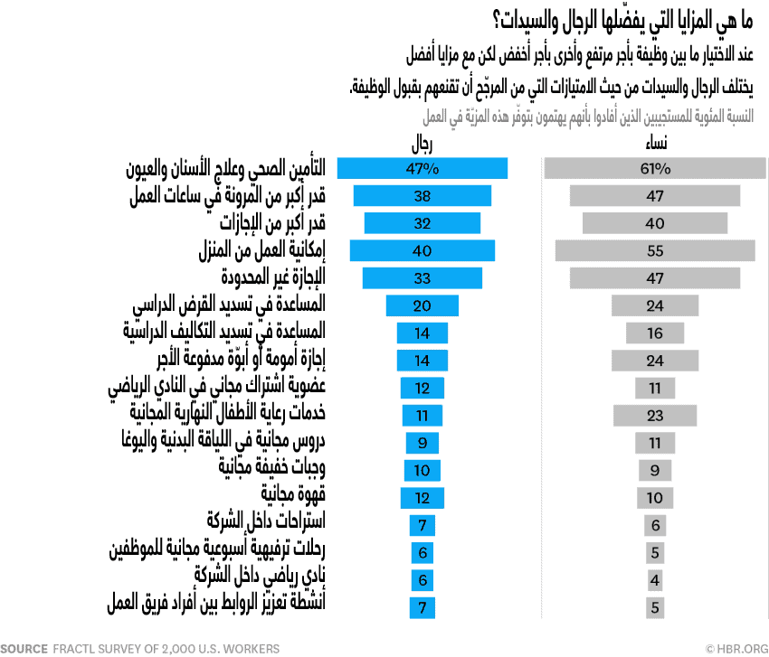 ولاحظنا وجود اختلاف بين الرجال والسيدات من ناحية درجة اهتمامهم في مزايا محددة. ومن أبرز ما أثار انتباهنا هو أنّ السيدات يُفضّلن المزايا التي تتعلق بشؤون الأسرة مثل إجازات الأمومة مدفوعة الأجر، وخدمات رعاية الأطفال النهارية المجانية. فقد حظيت ميزة إجازة الأمومة تقديراً كبيراً لدى الموظفات: إذ إنّ نسبة 25% من السيدات أفَدن بأنهن يهتممن كثيراً بإجازة الأمومة في أثناء اختيارهن للوظيفة (في حين كانت نسبة الرجال ممن أفادوا بذلك فقط 14%). وبالمقابل فاق اهتمام الرجال اهتمام النساء بمزايا توفّر أنشطة تعزيز الروابط بين أفراد فريق العمل، والاستراحات ووجبات الطعام المجانية. ومع أنّ الرجال والنساء على حد سواء أولوا اهتماماً بتوفر مزايا ترتبط بالرشاقة واللياقة في وظائفهم، إلا أنّ أنواع تلك المزايا المرغوبة تختلف بين الرجال والسيدات. فالسيدات غالباً ما يفضلن دروس الرشاقة واليوغا، بينما يميل الرجال أكثر إلى توفّر ناد رياضي داخل مبنى الشركة واشتراك مجاني بعضويته.