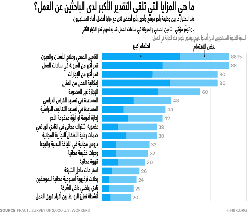 لكن ماذا عسى الشركات أن تفعل إذا لم تكن تمتلك مقدرة "جوجل" على تقديم المزايا؟ لست مضطراً إلى سرقة مصرف لتقدم العروض والمزايا الإضافية التي تجتذب الباحثين عن العمل. فحسب استطلاع جديد أجراه فريقي على موقع "فراكتل"، يولي الموظفون تقديراً كبيراً في المراتب التالية للضمان الصحي، ولمزايا لا تُكلّف المدراء أموالاً باهظة، مثل المرونة في ساعات العمل، وقدر أكبر من الإجازات مدفوعة الأجر، وإمكانية العمل من المنزل. فضلاً عن ذلك، وجدنا أنّ الباحثين عن فرص عمل إنما يفضلون الوظائف التي توفّر مزايا محددة على حساب عمل آخر بأجر مرتفع ومزايا قليلة.