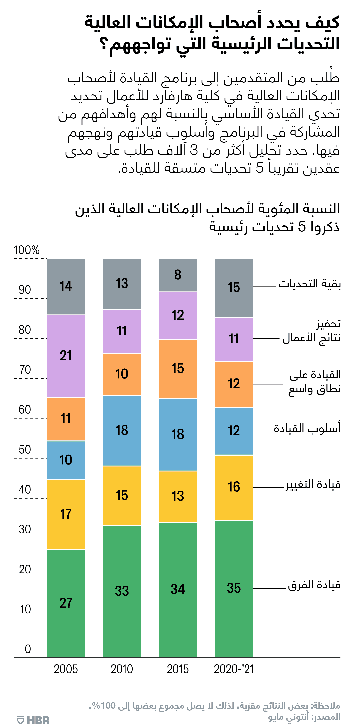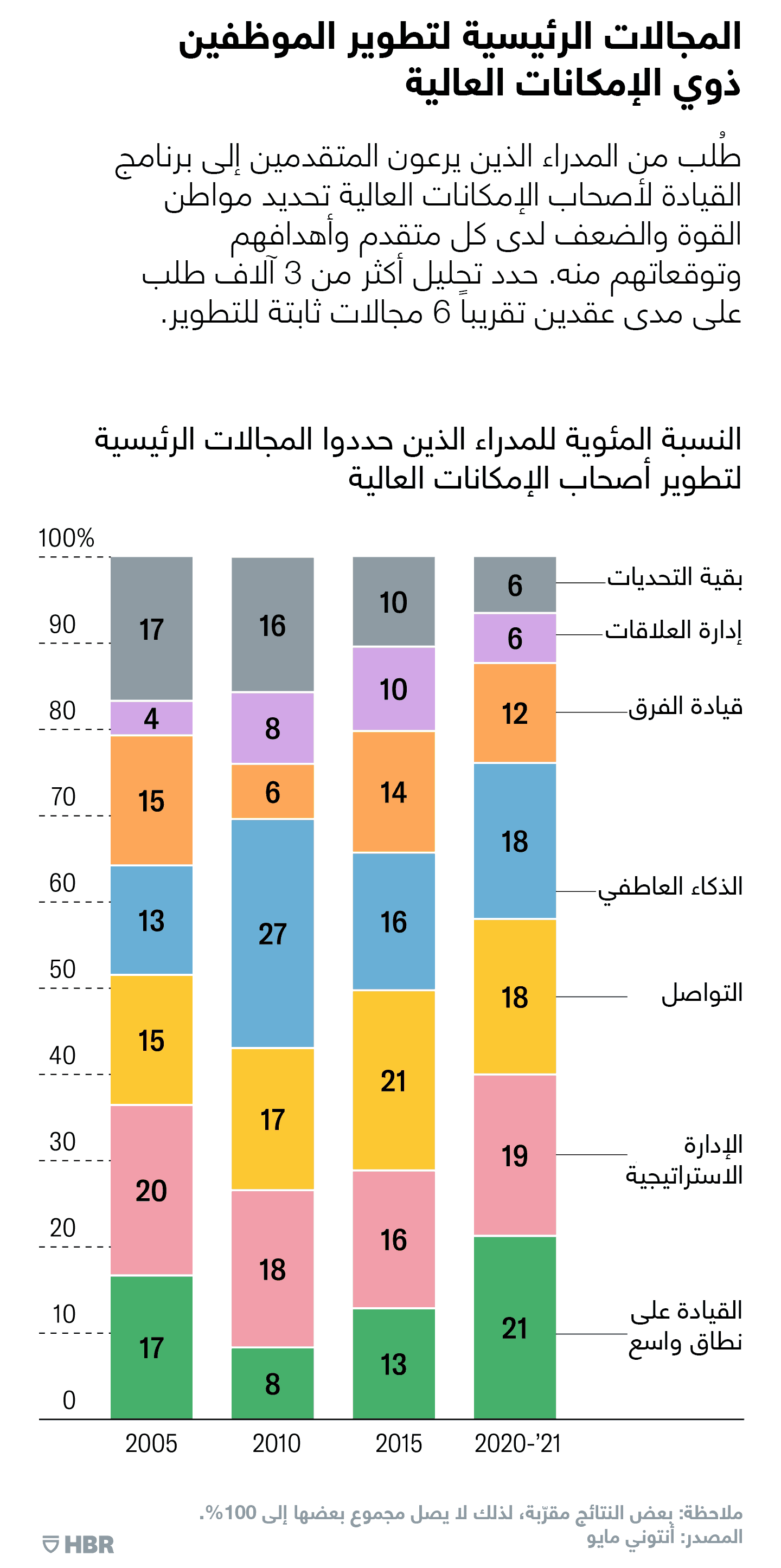 ملخص: حلل الباحثون أكثر من 3 آلاف طلب للاشتراك في برنامج القيادة لأصحاب الإمكانات العالية في كلية هارفارد للأعمال على مدى عقدين تقريباً، سعياً منهم لفهم التحديات الرئيسية للقيادة وفرص التطوير التي يواجهها الموظفون ذوو الإمكانات العالية على نحو أفضل. حدد أصحاب الإمكانات العالية 5 تحديات دائمة، هي: قيادة الفرق وقيادة التغيير وأسلوب القيادة والقيادة على نطاق واسع وتحفيز نتائج الأعمال، كما حدد الرعاة 6 مجالات لتطوير أصحاب الإمكانات العالية، هي: الإدارة الاستراتيجية والذكاء العاطفي والتواصل والقيادة على نطاق واسع وقيادة الفرق وإدارة العلاقات.