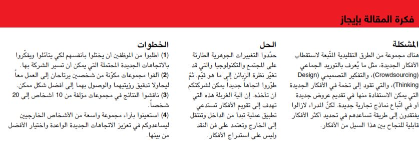 في عمليتي المؤلّفة من أربع خطوات، يشكّك الأفراد في افتراضاتهم، ويطرحون تفسيرات جديدة لمشاكل الزبون التي يمكن لشركتهم أن تحلّها. بعد ذلك يعمل الناس معاً ضمن مجموعات مؤلّفة من شخصين لتشذيب رؤيتهم، قبل الانتقال إلى مجموعة أكبر لمناقشة الفكرة. أخيراً، يجري اختبار أفضل الأفكار من قبل المستخدمين، ومن قبل الخبراء الداخليين والخارجيين المنتمين إلى مجموعة واسعة من المجالات والحقول. وبما أنّ أيّاً من الشركات الأربع والعشرين التي تدعم هذه الطريقة لم توظّف كلّ الخطوات، فإنّني سأوضحها من خلال طرح عدد من الحالات، بما في ذلك حالة فوكس (Vox)، وهي شركة بولونية متوسّطة الحجم متخصّصة بالمفروشات؛ وشركات نيست؛ ومايكروسوفت؛ وألفا روميو.