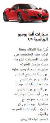 وقد تُرجمت الاستراتيجية الناتجة عن المفهوم المجرّد المطروح إلى سيّارة ألفا روميو C4، التي أطلقت عام 2013. فمقارنة مع العديد من السيّارات الرياضية الأخرى الموجودة في السوق، تُعتبرُ هذه السيّارة أزهد ثمناً، وهي تمتلك محرّكاً صغيراً، ووزنها خفيف، حيث يعود الفضل في ذلك جزئياً إلى الاستعمال الواسع لألياف الكربون وإلى إزالة بعض التجهيزات منها. (فعلى سبيل المثال، لا تضمّ السيّارة نظاماً للتوجيه المساعد). لكنّ نسبة عزمها إلى وزنها قريبة من تلك الموجودة في السيّارات الرياضية الأغلى ثمناً مثل فيراري. وقد حقّق هذا المفهوم نجاحاً باهراً، فخلال بضعة أسابيع من إطلاق السيّارة في السوق، كان الزبائن قد حجزوا العام الأوّل من الإنتاج كاملاً.