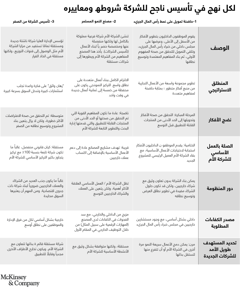 وبنهج مماثل لمصنع النمو السريع، تتمتع الشركة الناشئة الجديدة باستقلال تنظيمي ولكن لديها مجال أكبر لريادة الأعمال. وتعد السرعة أكثر أهمية من إتقان العمليات في مجالات مثل الموارد البشرية وتكنولوجيا المعلومات والمشتريات. وتطور الشركة الجديدة مجموعتها الخاصة من التقنيات، على سبيل المثال، وتستكشف نماذج أعمال مختلفة، بل يمكنها التعاون مع المنافسين التقليديين للشركة الأم. كما تستقل بنموذج التعيين وتحديد الرواتب عن الشركة الأم، بالإضافة إلى قدراتها الخاصة في مجال البحث والتطوير ورؤى دخول أسواق جديدة تمامًا. وغالبًا ما تبدأ الإدارة العليا التي نجحت في دفع عجلة النمو عبر تأسيس شركة من الصفر في التحول إلى تكييف مبادئ نهج مصنع النمو السريع الذي أوضحناه في القسم السابق.