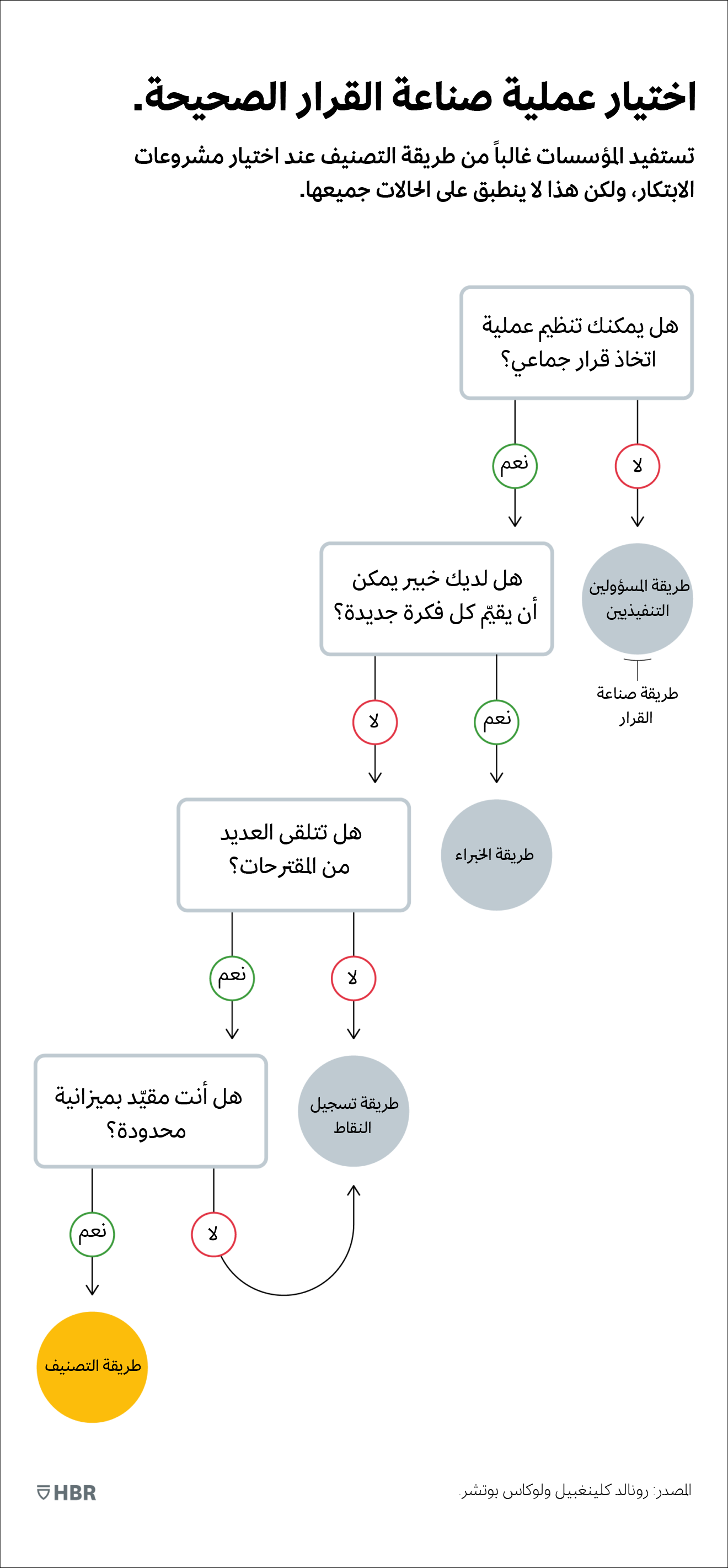 لتحقيق هذه الغاية، نظرنا في بعض الطرق الشائعة التي تتبعها المؤسسات في صنع القرارات المتعلقة بمشروعات الابتكار.