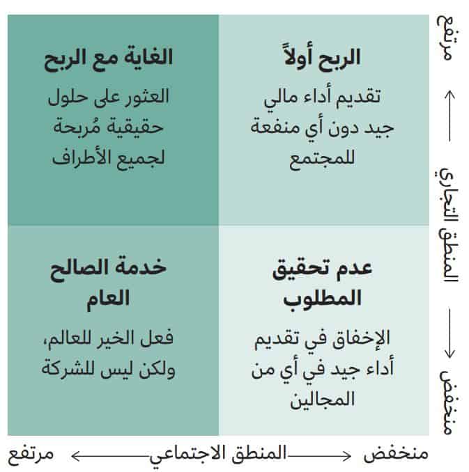 انظروا إلى الفقرة الجانبية التي تحمل عنوان "الموازنة بين الغاية والأرباح عند اتخاذ القرارات". تدّعي كل شركة متمحورة حول غاية معيّنة وتهدف إلى تحقيق الأرباح أنها تسعى إلى أن تكون في مربّع "الغاية مع الربح". تتمكن الشركات ذات الغاية السامية العميقة، التي يترأسها قادة يتبنّون فلسفة مثالية عملية، من الوصول إلى هذا الهدف أكثر من غيرها لأنها ليست ملتزمة في حقيقة الأمر بتحقيق الغاية والربح فحسب، بل هي مستعدة أيضاً للبقاء في مربّع "الربح أولاً" أو مربّع "خدمة الصالح العام" لفترة معيّنة من الزمن، شريطة أن ترى طريقة تسمح لها بالانتقال جانبياً أو إلى الأعلى للوصول إلى الحالة المثالية المُربحة لجميع الأطراف في المستقبل. وقد تتجنب هذه الشركات القرارات التي تقود إلى مكسب تجاري فقط دون أن تنطوي على أي احتمال لتحقيق منفعة اجتماعية. أما إذا كان هناك خيار لتعزيز الأرباح بطريقة ستؤدي يوماً ما إلى نشر الخير العميم، فإنها قد تتبنى هذا الخيار وتسعى بجد لضمان أن تعمل في نهاية المطاف على توفير المنافع لأصحاب المصلحة المتعددين. وعلى المنوال ذاته، إذا كانت لديها فكرة لخدمة الصالح العام تؤمن بأنها ستصبح فكرة مُربحة مع مرور الوقت، فإنها قد تجازف بتبنّيها ومن ثم ستفعل كل ما بوسعها لضمان نجاحها مالياً.