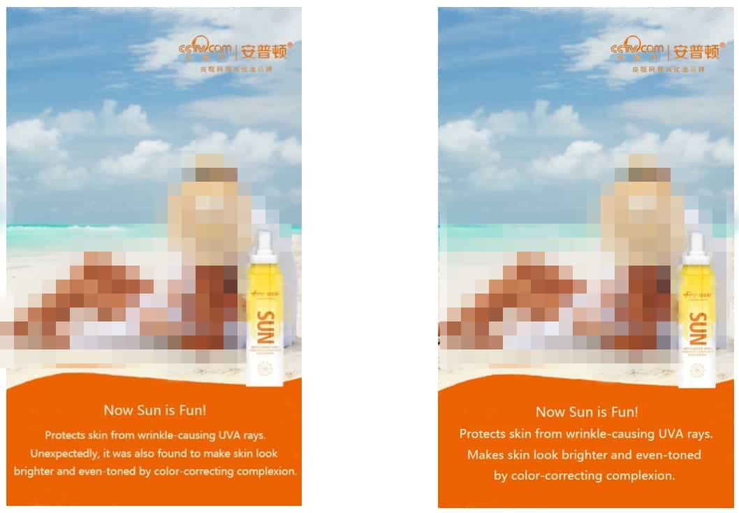 من أجل استكشاف أي الاستراتيجيتين أكثر فاعلية أجرينا تجربة ميدانية بالتعاون مع أحد تجار التجزئة الإلكترونية لمنتجات التجميل في الصين. ابتكرنا نسختين مختلفتين للإعلان عن رذاذ الحماية من الشمس، يقدم كلاهما ميزتين لهذا الرذاذ: الوقاية من الأشعة الفوق بنفسجية وشد البشرة أيضاً. (انظر صور الإعلان بالأسفل. لاحظ أن الإعلانات الأصلية التي قدمت للمستخدمين كانت باللغة الصينية). على الرغم من ذلك كانت نسخة من الإعلان تقدم الميزتين على أنهما مقصودتان، بينما تقدم الأخرى شد البشرة باعتباره ميزة غير متوقعة. أرسل تاجر التجزئة الإعلانين عن طريق منصة "وي تشات" (WeChat) إلى 21,514 مستهلكاً مشتركاً على متجرهم في المنصة. أرسل كل إعلان إلى نصف هؤلاء المستخدمين.