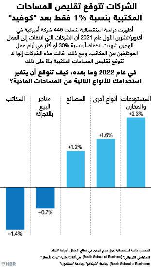 ملخص: خلال انتقال موظفي المعرفة إلى العمل الهجين، لم نشهد انخفاضاً مكافئاً في الطلب على المساحات المكتبية. تشير بيانات استُخلصت من دراسة استقصائية جديدة إلى أن نسبة تقليص المساحات المكتبية تتراوح من 1% إلى 2% في المتوسط. هناك 3 توجهات تدفع ذلك: 1) الموظفون منزعجون من الزحام في أماكن العمل، والطريقة الوحيدة المؤكدة النجاح لتقليل الكثافة هي بتقليل عدد أيام العمل في المكتب دون تقليص المساحة، و2) يرغب معظم الموظفين في العمل من المنزل يومي الاثنين والجمعة، ما يعني أن التحول إلى العمل الهجين لا يوفر سوى فرص ضئيلة للاقتصاد في الحيز المكتبي، و3) يعيد أصحاب العمل تصميم المساحات المكتبية لتصبح مساحات اجتماعية أكثر جاذبية تشجع على التعاون المباشر والإبداع والتفاعلات العفوية.