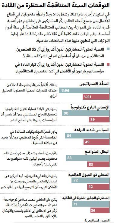 لنراجع مثلاً كيف تطورت المهارات التي يحتاجها القادة للنجاح مع مرور الوقت، وإلى أي مدى نرى أن هناك معاناة لدى كثير من التنفيذيين في تلبية هذه المطالب الجديدة. فقد كانت دراسة حديثة أجرتها "استراتيجي&" (Strategy&)، وهي شركة استشارات استراتيجية عالمية تابعة لشركة "بي دبليو سي" (PwC)، قد سلطت الضوء على أهمية الموازنة بين صفات محددة قد تبدو متناقضة ظاهرياً. فنحن كنا معتادين، مثلاً، على قبول أن يكون القائد إما شخصاً عظيماً من أصحاب الرؤى أو مشغلاً عظيماً. لكن هذه لم تعد صالحة بعد الآن، فالشركات بحاجة الآن إلى أن يكون قادتها قادرين على أداء الدورين معاً، أي بعبارة أخرى، أن يكونوا منفّذين استراتيجيين. كما يُنتظرُ منهم أن يكونوا أشخاصاً إنسانيين بارعين تكنولوجياً، وسياسيين شديدي النزاهة، وأبطالاً متواضعين، وأشخاصاً محليين ذوي ميول عالمية، ومبتكرين ضاربي الجذور في التقاليد (راجعوا الفقرة الجانبية بعنوان "التوقعات الستة المتناقضة المنتظرة من القادة"). ولم تكتف غالبية المشاركين في الاستطلاع بالموافقة على أهمية هذه الأدوار، وإنما عبّرت أيضاً عن مخاوف مقلقة بخصوص افتقار القادة إلى البراعة في أدائها. غير أن معالجة الفجوات والثغرات الموجودة لدى قيادات الشركات لا تقتصر على بناء المهارات الفردية للتنفيذيين. فرغم أن هذا الشيء مرغوب بكل تأكيد، إلا أن هناك حاجة ملحّة لتحسين القيادة الجماعية.