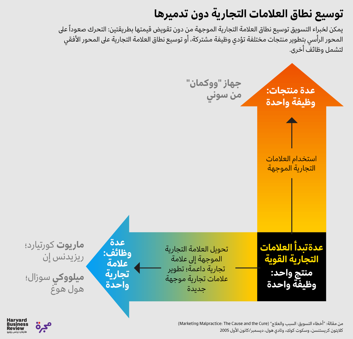 يمكن لخبراء التسويق توسيع نطاق العلامة التجارية الموجهة من دون تقويض قيمتها بطريقتين: التحرك صعوداً على المحور الرأسي بتطوير منتجات مختلفة تؤدي وظيفة مشتركة، أو توسيع نطاق العلامة التجارية على المحور الأفقي لتشمل وظائف أخرى.