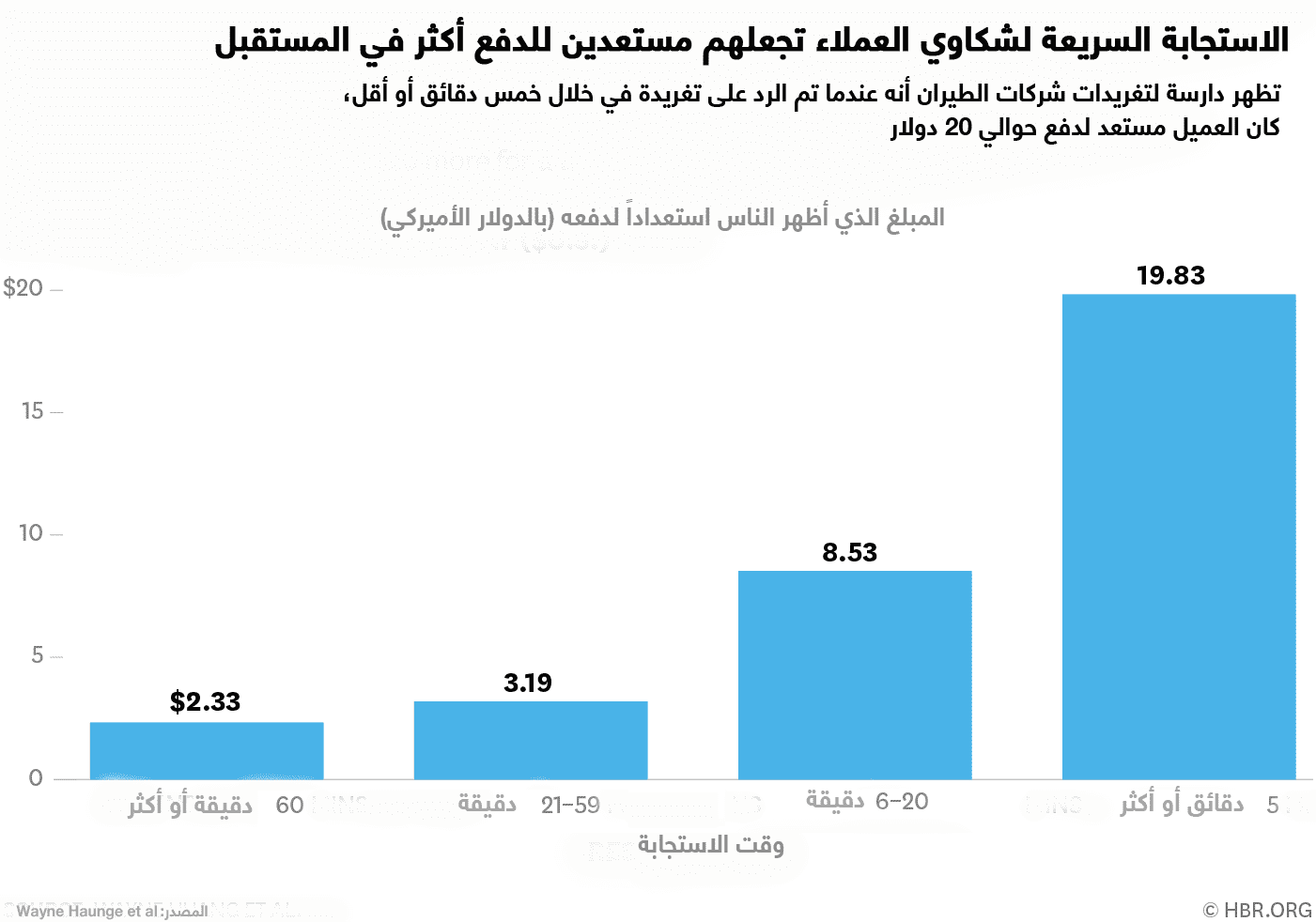 إلى جانب ذلك، يتوجب على ممثلي خدمة العملاء التحرك سريعاً للاستفادة من هذه الفرص. بالنسبة لشركات الطيران، وجدنا أنه بعد انقضاء 20 دقيقة، كان العملاء على استعداد لدفع 3 دولارات أخرى فقط، أي بانخفاض قدره 85 في المئة في القيمة مقارنة بالزبائن الذين حصلوا على رد خلال خمس دقائق أو أقل. بعد مضي ساعة، كان العملاء على استعداد لدفع 2 دولار فقط. ووجدنا أنّ متوسط الوقت الذي استغرقته شركات الطيران للرد على التغريدات في عينتنا كان حوالي 20 دقيقة، وهذا يعني أنّ ما لا يقل عن نصف شركات الطيران كانت تترك مبالغ كبيرة على الطاولة.