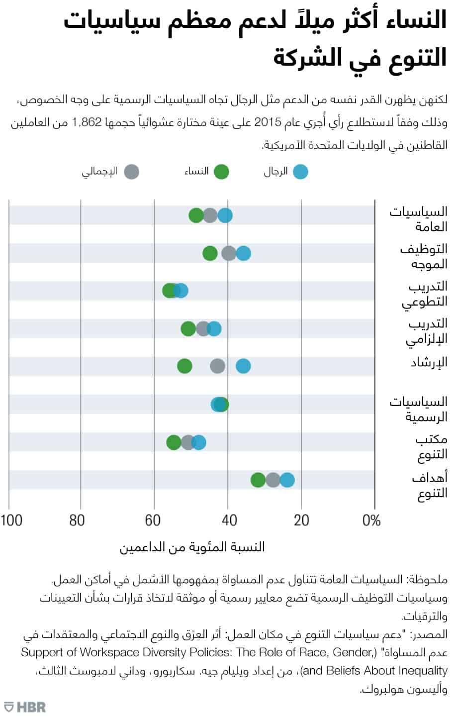 وبالنظر إلى إجمالي مستويات الدعم التي تحظى بها سياسات التنوع المختلفة، نجد أن أكبر قدر من الدعم كان من نصيب سياستين، وهما التدريب التطوعي، وإنشاء مكتب للتَنَوّع. وهذا خبر سار، لأن هاتين السياستين قد ثَبت أنهما تعملان على تحسين مستوى التنوع في مكان العمل. ولكن لسوء الحظ، لوحظ أن سياستين أخريين ثبُتت فاعليتهما كاستراتيجيات لدعم التنوع، وهما التوظيف الموجه، ووضع أهداف تنوع خاضعة للمساءلة، كانتا الأقل شعبية. ونحن نرى أن هذه التفاوتات في مستوى الدعم تنبع من تفسير العاملين لهاتين السياستين على أنهما أكثر إلزامية مقارنة بالسياستين السابقتين. وذلك يتسق مع نتائج بحث آخر أشار إلى أن العاملين يميلون إلى معارضة مبادرات دعم التنوع التي تُفرض عليهم.