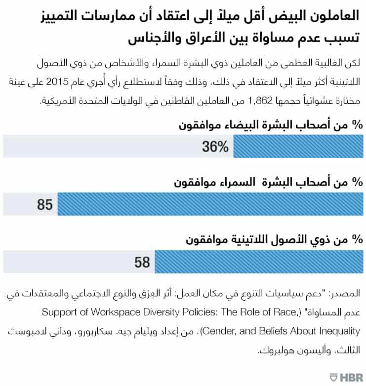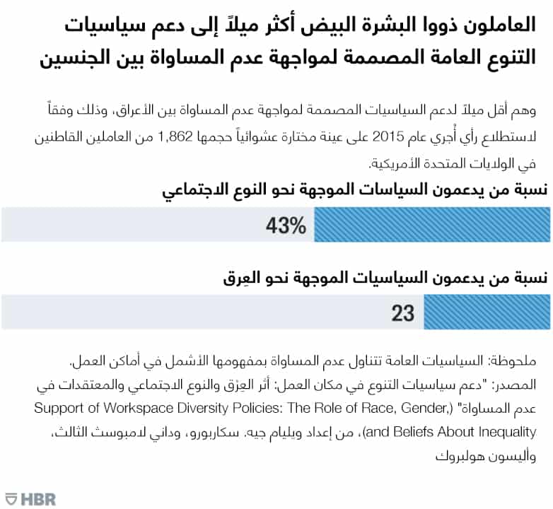 وقد كشف تحليلنا عن أن من آمنوا أن التمييز القائم على النوع الاجتماعي أو العِرْق قد تسبب في حصول النساء وذوي البشرة السمراء على وظائف أقل شأناً، وبالتالي أجوراً أقل مقارنة بذوي البشرة البيضاء، كانوا أكثر دعماً لسياسيات التنوع في أماكن العمل. وفي الوقت ذاته، فالعاملون الذين آمنوا أن عدم المساواة بين الأعراق أو الأجناس كان سببها الرئيس هو الفوارق التعليمية، أو الاختلافات في التدريب، أظهروا مستويات دعم أقل نسبياً.