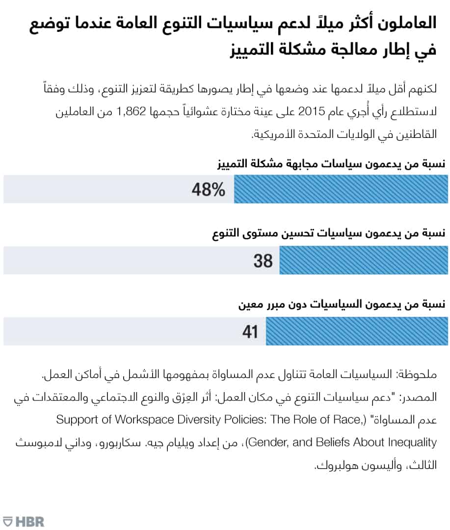 ضع سياسيات التنوع في إطار يظهرها كوسائل لمواجهة التمييز. تحظى مبادرات التنوع بمزيد من الدعم عندما توضع في إطار يظهر أهميتها في مواجهة مشكلة التمييز. وبينما يعد تعزيز التنوع في أماكن العمل هدفاً قيماً، يظهر العاملون حماسة أكبر تجاه السياسيات الرامية إلى معالجة مشكلات تتعلق بعدم المساواة الاجتماعية. ونقترح أن يعمل المدراء على إثراء هذا الاهتمام، وعلى وضع سياسيات التنوع في إطار عبر منظور يشرك العاملين في حل المشكلات الاجتماعية. وإحدى الطرق الفاعلة لإدراك ذلك هي توعية العاملين بشأن الدور الذي يلعبه التمييز، والهياكل الاجتماعية في أنماط عدم المساوة بين الأجناس، والأعراق، والطبقات الاجتماعية. وأيضاً من الجدير بالذكر، أن تنمية الوعي في أماكن العمل بشأن الدور الذي يلعبه التمييز في أنماط عدم المساواة من شأنها أن تحد من التفاوتات بين الأجناس والأعراق فيما يخص مستوى مناصرتهم لسياسيات التنوع – إذ أوضحت دراستنا أن هذه المعتقدات كانت سبباً رئيساً في إبداء الرجال قدراً أقل من الدعم لسياسيات التنوع في أماكن العمل مقارنة بالنساء والملونين غير ذوي البشرة البيضاء.
