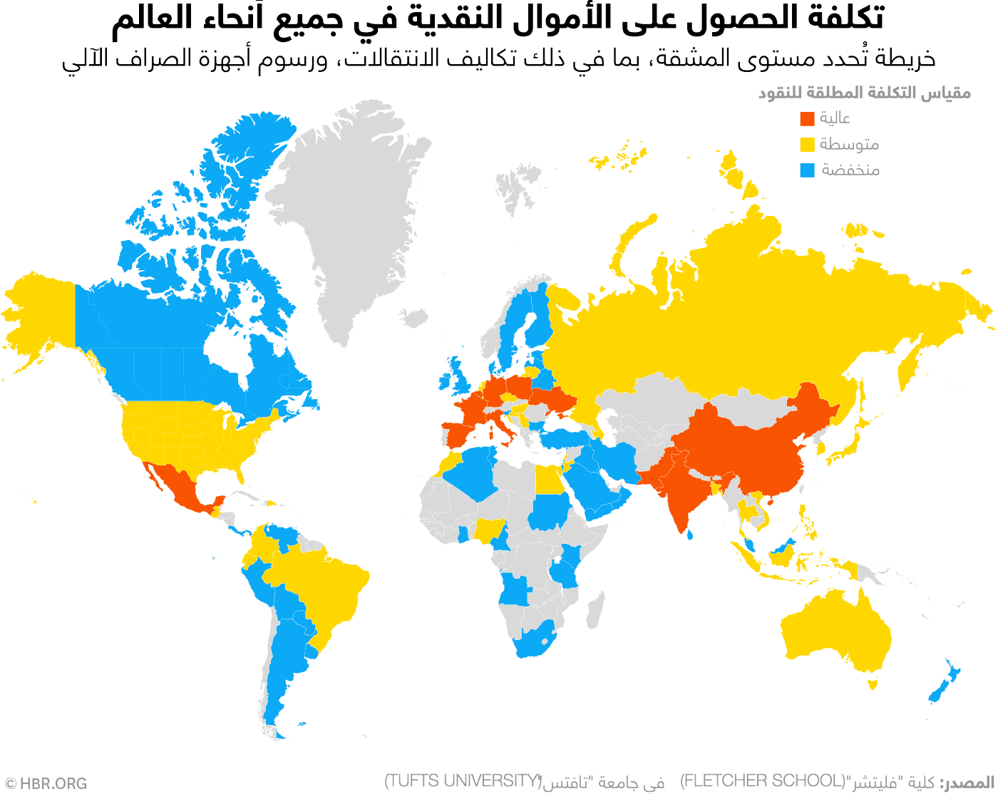 تنبيه بخصوص تفسير الخريطة أدناه: هذا لا يعني أن الدول ذات التكاليف "المنخفضة" للتعاملات النقدية أصبحت أقرب إلى أن تصبح مجتمعات غير نقدية، أو أنها لا تحتاج إلى فعل أي شيء لتغيير الوضع الراهن. بل تشير كل الخريطة إلى أن تكاليف الحصول على الأموال النقدية في هذه البلدان أقل نسبياً مقارنةً بباقي البلدان.