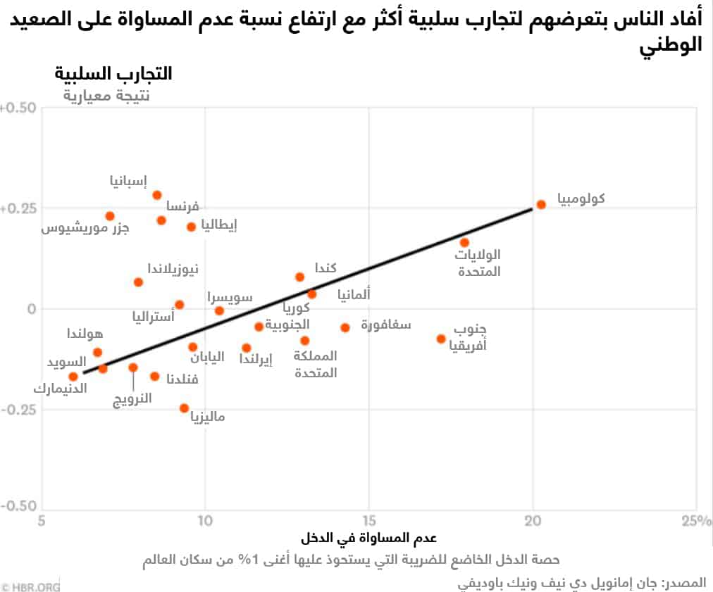 لكن الجانب الآخر من التجارب العاطفية الإيجابية اليومية هي تجارب عاطفية سلبية، وقد وجدنا أن هذه الزيادة ترتفع مع المدخول الذي يحصل عليه أغنى 1%. ففي المجتمعات التي يحتفظ فيها الأغنى بأغلبية دخل البلاد، كان الناس أكثر عرضة للإبلاغ عن شعورهم "بالتوتر" أو "القلق" أو "الغضب" في اليوم السابق للمسح.