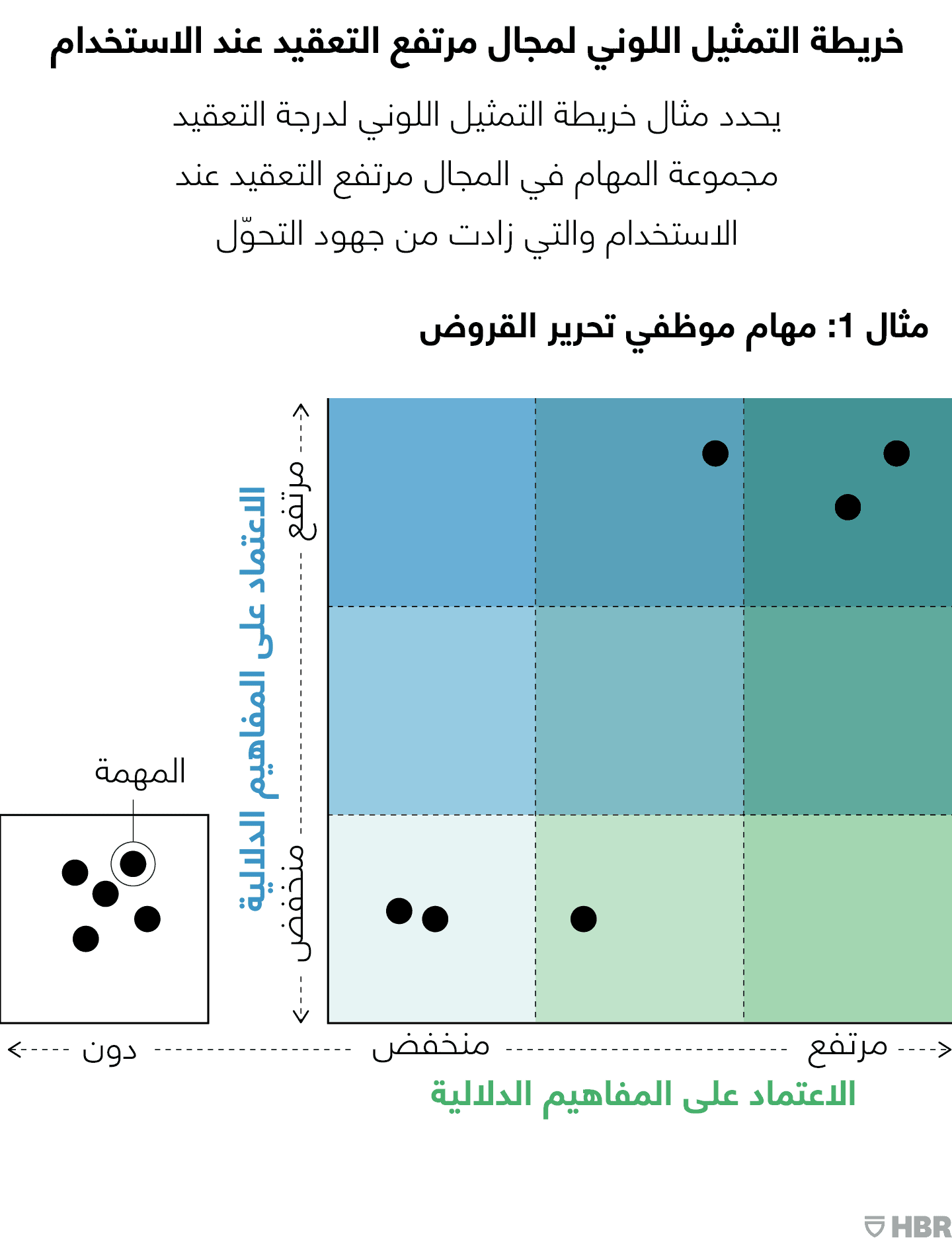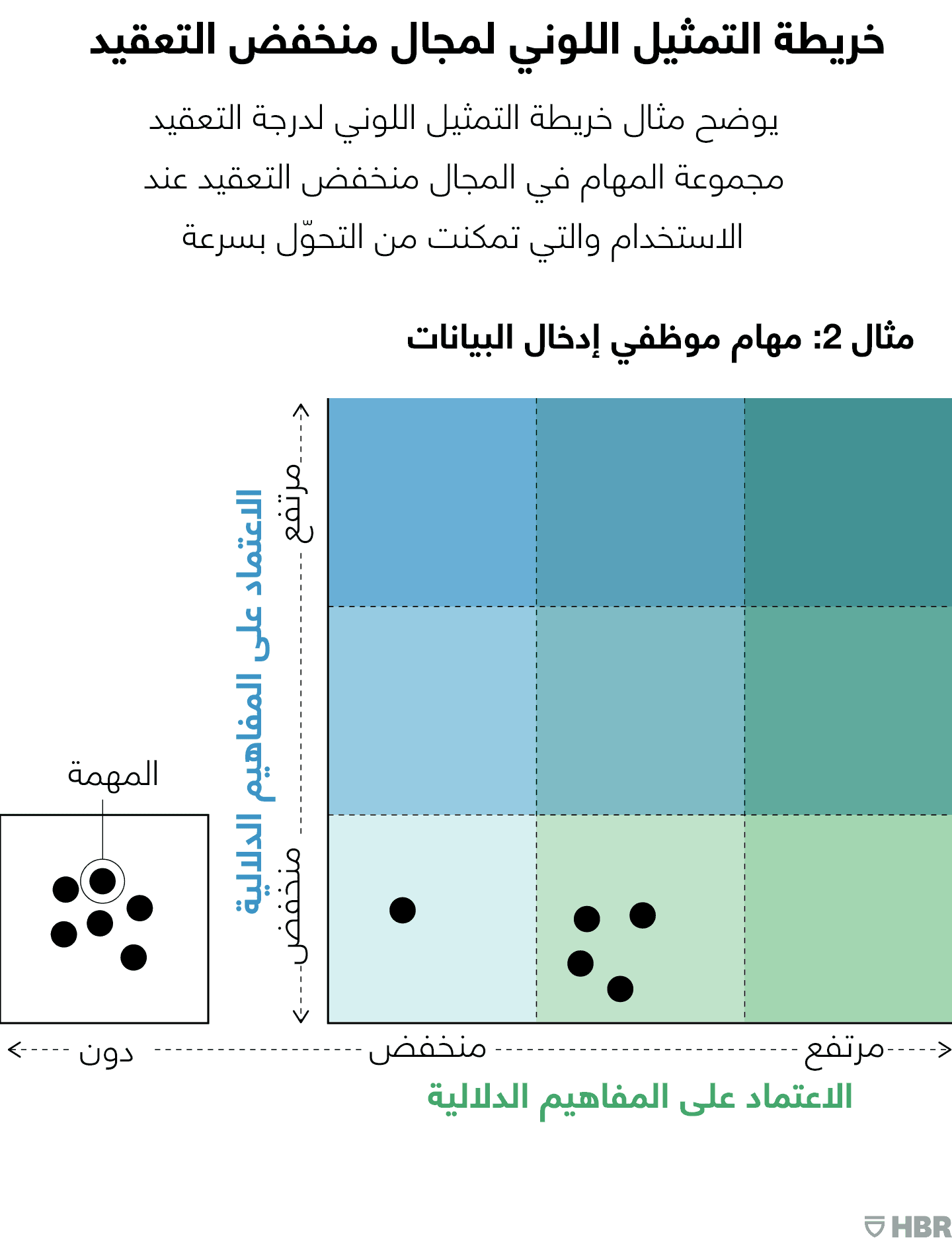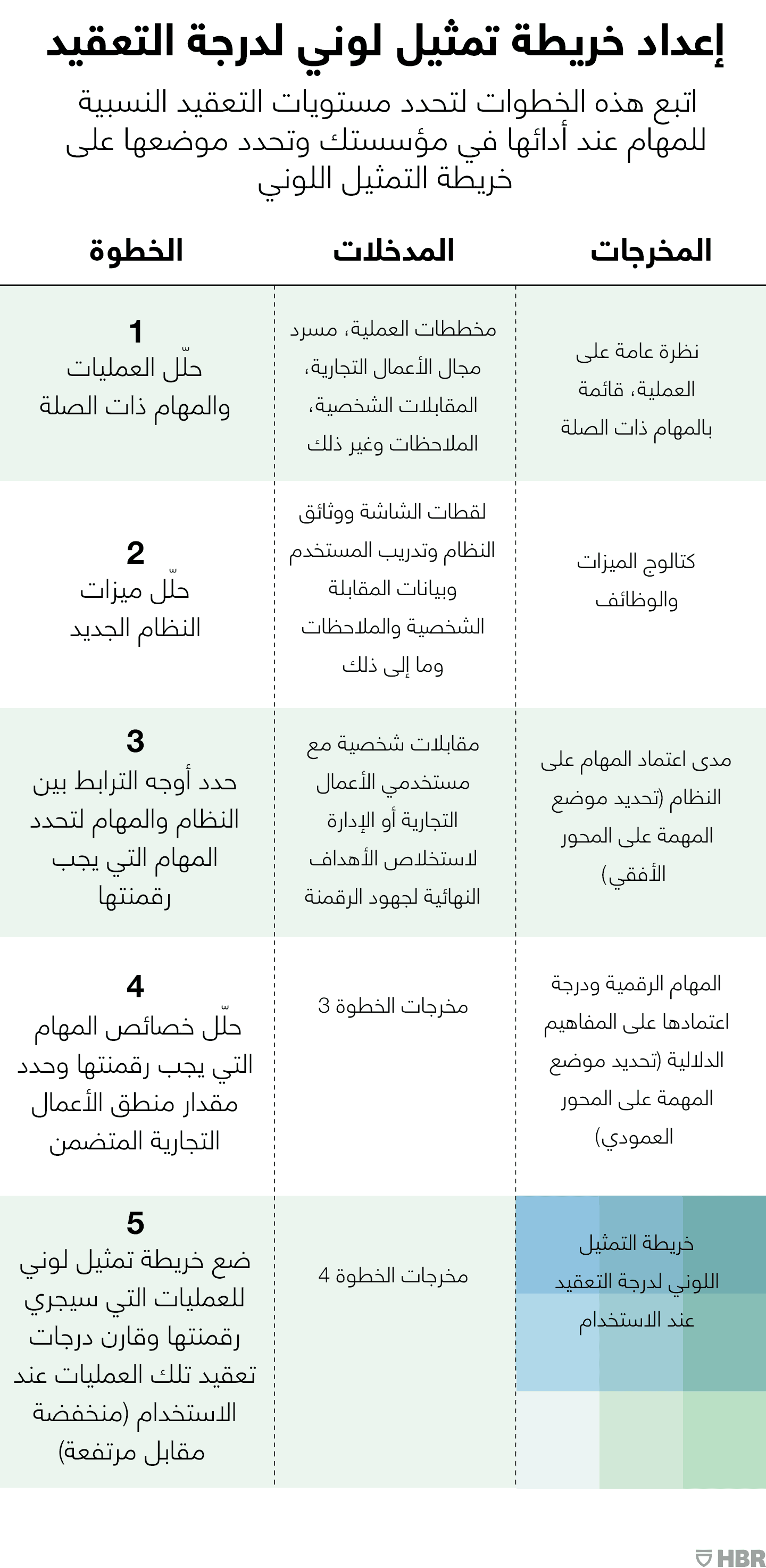 ستكشف الخطوتان الأولى والثانية عن المهام التي ستعتمد على النظام الجديد وكيفية استخدام النظام للتعامل معها، وهو ما يتيح لك الانتقال إلى الخطوة 3، حيث ستحدد مكان المهام الفردية على المحور الأفقي لخريطة التمثيل اللوني (انظر الأشكال أدناه). وبمجرد أن تحدد المهام التي تعتمد على النظام، ستكشف الخطوة 4 عن مدى اعتماد تلك المهام على النظام (المحور العمودي). وبمجرد أن تفهم مكان وجود المهمة على المحور الأفقي، يمكنك البدء في إعداد خريطة تمثيل لوني (الخطوة 5) لتوضيح المستويات النسبية للتعقيد عند الاستخدام في المهام المختلفة التي سيجري رقمنتها. ضع المهام التي لا تستخدم النظام في المربع "دون" كما هو موضح في الأشكال البيانية.