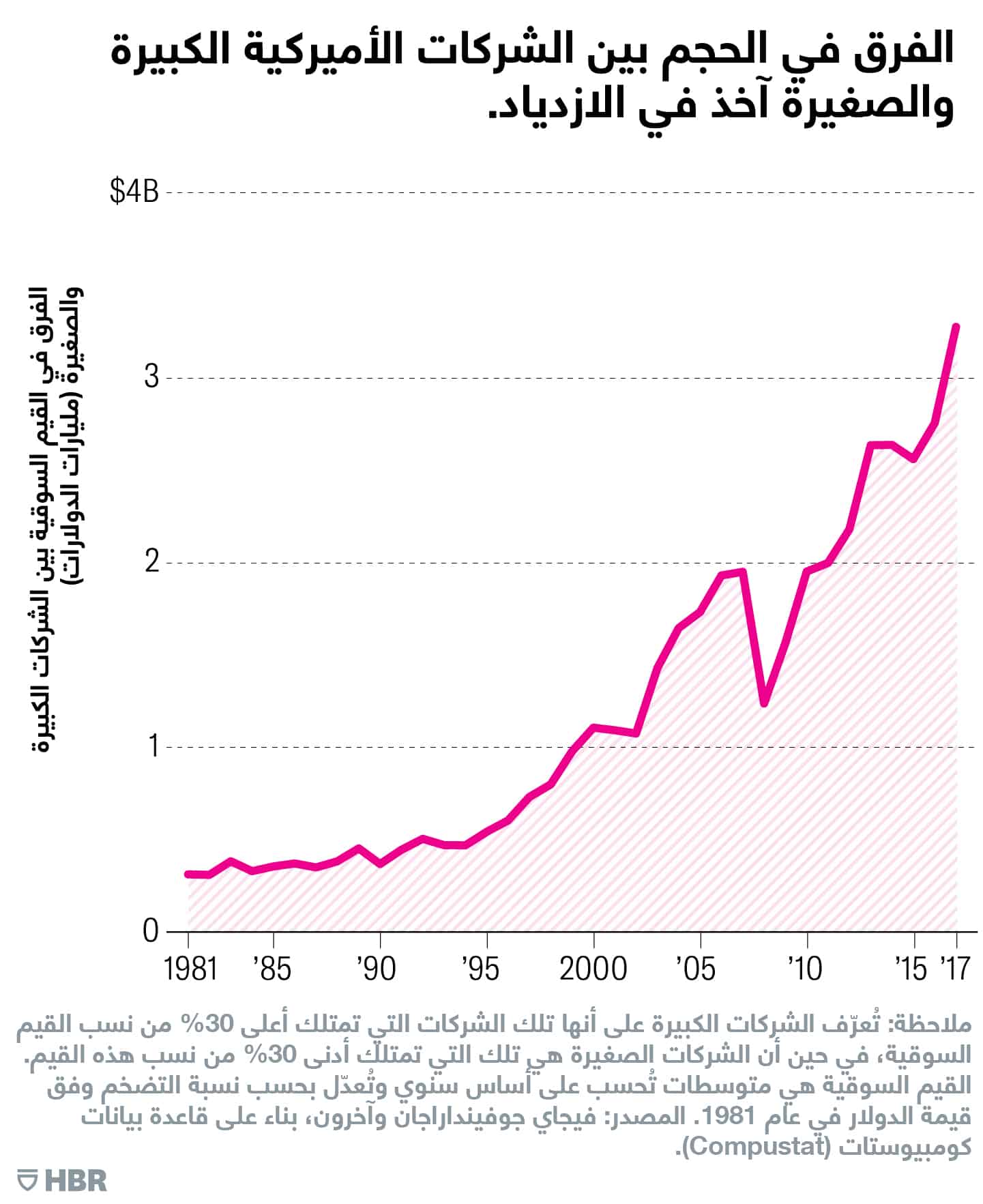 وبإمكانكم ملاحظة الفرق السنوي المعدل بحسب نسبة التضخم بين القيم السوقية المتوسطة لأكبر الشركات العامة المدرجة في أسواق الأوراق المالية الأميركية وأصغرها في المخطط البياني أدناه، حيث أشرنا إلى أفضل 30% وأسوأ 30% من نسب القيم السوقية لأسهم الشركات. ومن الواضح أن الفرق في الحجم بين الشركات الكبيرة والصغيرة قد ازداد بشكل مستمر وسريع منذ منتصف التسعينيات، باستثناء فترة الركود التي حصلت بين عام 2008 وعام 2009، حيث بلغت هذه الفجوة حوالي 3.5 مليار دولار، بحسب قيمة الدولار عام 1981، في حين بلغت هذه الفجوة حوالي 8.8 مليار دولار بحسب قيمة الدولار في عام 2017. ونظراً إلى أننا ندرس القيم المتوسطة، نجد أن هذا الاختلاف غير مدفوع بالنجاح الهائل الذي حققته قلة من الشركات مثل شركتي "آبل" و"أمازون". وعندما أجرينا دراسة مفصلة على الشركات الكبيرة والصغيرة، وجدنا أن الشركات الكبرى تزداد نمواً، في حين تعاني الشركات الأصغر من الركود.
