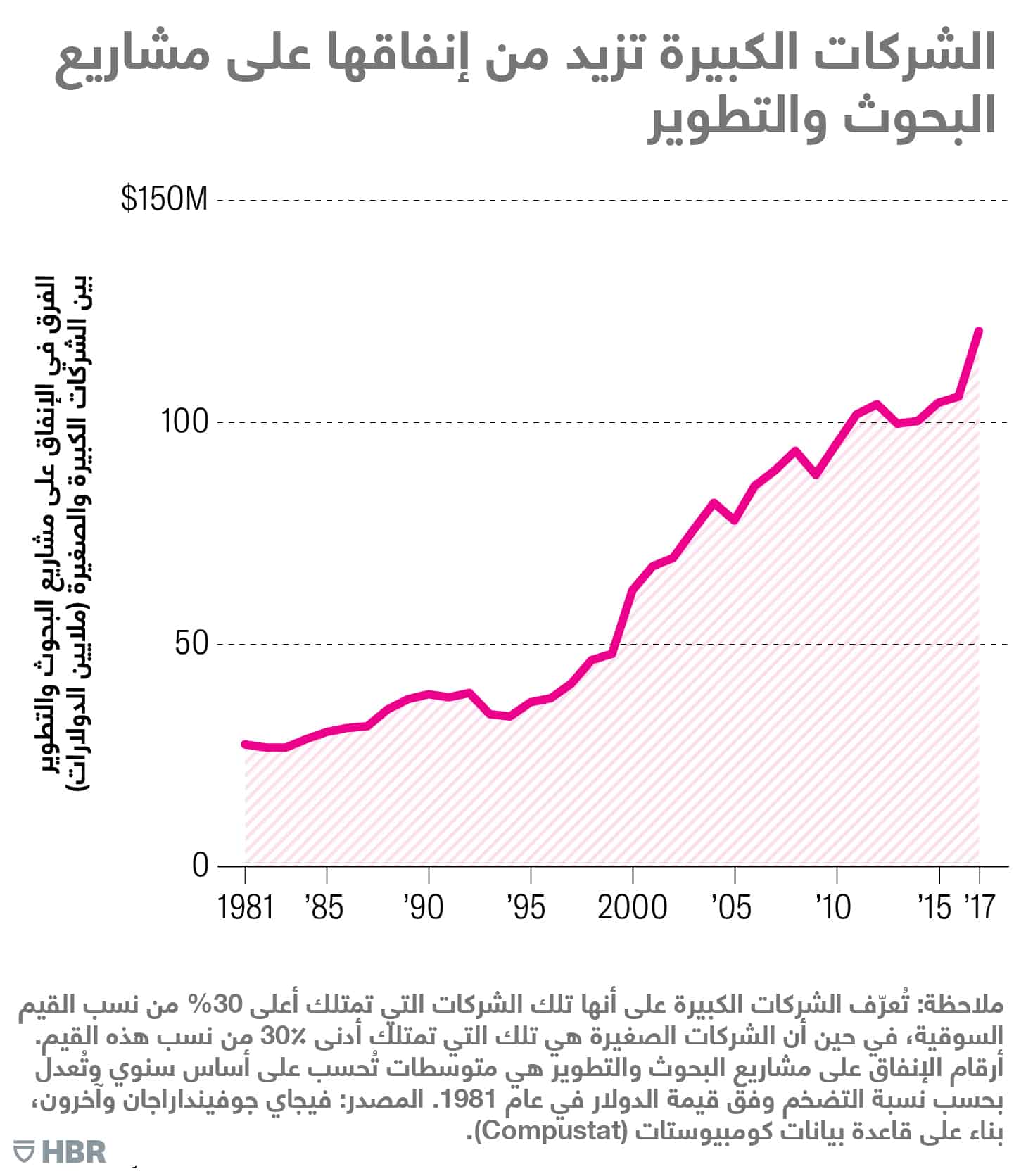 وعندما ندرس الدافع الرئيس لأداء المؤسسة ونموها، مثل معدل الاستثمار في الأصول الملموسة وغير الملموسة، مثل البحوث والتطوير والعلامات التجارية والتقنيات والموارد البشرية، وغير ذلك، نجد زيادة كبيرة في الفجوة بين الشركات الكبيرة والصغيرة فيما يخص مقدار الاستثمار في الأصول غير الملموسة. على سبيل المثال، يوضح المخطط البياني أدناه أن الفرق بين متوسط الإنفاق السنوي على مشاريع البحوث والتطوير لدى الشركات الكبيرة والصغيرة ارتفع من أقل من 20 مليون دولار في الثمانينيات إلى ما يقرب من 120 مليون دولار في عام 2017 (المعدّل بحسب نسبة التضخّم وفق قيمة الدولار في عام 1981). في المتوسط، أنفقت شركة ما كبيرة 330 مليون دولار على مشاريع البحوث والتطوير في عام 2017، في حين بلغ متوسط إنفاق شركة صغيرة حوالي 6 ملايين دولار، ومن الواضح أن هذا المبلغ غير كاف لمواكبة منافس كبير إلا عبر ضربة حظ. كما أن انخفاض إنتاجية استثمارات البحوث والتطوير يزيد الأمور سوءاً بالنسبة إلى الشركات الصغيرة.