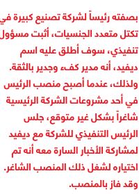 بعد طرح بضعة أسئلة، ومعرفة الزيادة السخية في الراتب التي سيحصل عليها مع هذه الترقية، وجّه ديفيد الشكر للرئيس التنفيذي ولرئيس قسم الموارد البشرية بكل حرارة ومودة ووعد بمناقشة الفرصة مع زوجته في مساء ذلك اليوم. وردوا عليه جميعاً بابتسامة: "بالطبع، لك هذا".