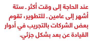 عند الحاجة إلى وقت أكثر ـ ستة أشهر إلى عامين ـ للتطوير، تقوم بعض الشركات بالتجريب على أدوار القيادة عن بعد بشكل جزئي لاستيعاب أعضاء الأسر التي يعمل فيها الزوجان في نفس الوقت. يعمل المدراء لمدة ثلاثة إلى أربعة أيام في الأسبوع في الموقع المعينين فيه، ويعملون في الفترة المتبقية من الأسبوع من المنزل. من الناحية التاريخية، هذا النوع من الترتيب تم تحويله إلى وصمة، حسبما يشير رئيس الموارد البشرية في شركة تعدين عالمية شارحاً: "راح قادة العمل يعتقدون أن هذا النوع من الترتيب يشير إلى انعدام الالتزام وأن الأشخاص الذين يستخدمونه إنما يفعلون ذلك ليعملوا ساعات أقل وحسب." ولكن الشركات، بما فيها شركته هو، راحت تغير أوضاعها. "هناك أعداد متزايدة من الأشخاص في منظومة الأشخاص من أصحاب المواهب يطلبون ذلك، وتوجد لدينا التقنية التي تجعل ذلك ينجح، ولذلك فإننا أكثر انفتاحاً وقبولاً ـ وخاصة عندما يكون محتملاً أن يعود الشخص أو موطنه الأصلي في نهاية مهمته الوظيفية." وقد دعّمت هذه الرؤية مجموعة متنامية من البحوث التي أظهرت أن الأشخاص الذين يعملون عن بعد عبر وسائل التواصل الإلكتروني لا يعملون أقل من زملائهم الذين يعملون في المكتب. في الواقع، إنهم يقومون في الغالب باستثمار ساعات أكثر، كما إنهم أكثر إنتاجية في الساعات التي يعملونها.