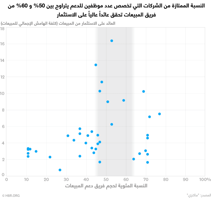 النسبة الممتازة من الشركات التي تخصص عدد موظفين للدعم يتراوح بين 50% و60% من فريق المبيعات تحقق عائداً عالياً على الاستثمار.