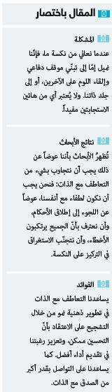 عندما يواجه الناس نكسة في مكان العمل، سواء تمثّل الأمر في مبيعات سيئة خلال أحد الأرباع المالية، أو عدم الحصول على الترقية المستحقة، أو الدخول في نزاع مع أحد الزملاء، فإنه من الشائع أن يتجاوبوا بطريقة من اثنتين: فإمّا أن يتّخذوا موقفاً دفاعياً وينحوا باللائمة على الآخرين، أو يقلّلون من شأن أنفسهم. المؤسف في الأمر هو أنّ أيّاً من ردّي الفعل هذين لا يعتبر مفيداً. فتحاشي تحمّل المسؤولية من خلال اللجوء إلى الدفاع قد يخفّف من وقع الوخزة التي يتسبّب بها الفشل، لكنّ ذلك يأتي على حساب التعلّم. أمّا جلد الذات، من جهة أخرى، فقد يبدو أمراً مرغوباً في تلك اللحظة، لكنّه يمكن أن يقود إلى تقويم سلبي وغير دقيق للقدرات الذاتية الأمر الذي يقوّض التطوّر الشخصي.