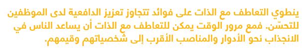 عندما يتجاوب القادة مع حالات الفشل والنكسات بذهنية التعاطف مع الذات، فإنهم هم أنفسهم يستفيدون، ويكونون أقرب إلى إظهار الميول النفسية والسلوكية التي تساعدهم شخصياً في تحقيق النجاح والتطوّر المهنيين. ويمكن لهذه الفوائد أن تمتد لتشمل المرؤوسين، ممّا يجعل ممارسة التعاطف مع الذات أمراً مربحاً للقادة وللناس الذين يعملون تحت أمرتهم في الوقت نفسه.
