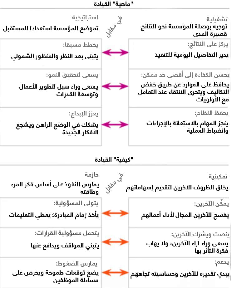 تُفهم القيادة عادة في سياق الموازنة بين ثنائيتين أساسيتين. وتحدد القيادة الاستراتيجية في مقابل القيادة التشغيلية "ماهية" عمل القائد: هل تبادر بتعديل وضع شركتك بحيث تصبح منافسة مستقبلاً وتقودها إلى تحقيق النتائج المرجوة الآن؟ وتتعلق الإدارة الحازمة في مقابل القيادة التمكينية بـ "الكيفية": هل يمكنك احتلال الصدارة وإفساح المجال للآخرين للتقدم بإسهاماتهم؟