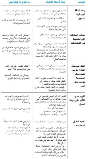 إليك مثالاً يوضح كيف يحدث ذلك: كان لدى إحدى شركات الأسهم الخاصة التي بحثناها بروتوكول صارم لإدارة اجتماعات فعالة. حيث كان يتم في كل جلسة إرسال التحضير للاجتماع بإشعار مناسب، وتم فيه تحديد الأهداف، وكان وقت الاجتماع يُدار طبقاً لجدول أعمال. وكان يتم التعامل مع مستجدات وقرارات المجموعة بكفاءة. ولكن مع نمو حجم الشركة بمرور الوقت، تمت إضافة المزيد والمزيد من الاجتماعات إلى جدول الأعمال الأسبوعي. وبالرغم من أن الاجتماعات كانت تدار بشكل جيد، فإن كمها الهائل عرقل تدفق العمل وبدَّد الوقت الذي كان بإمكان موظفي الشركة أن يكرّسوه لأداء المهام الفردية المهمة، مثل رصد فرص الاستثمار الجديدة وتعميق العلاقات مع مديري الشركات التي تملكها الشركة أو تسعى لامتلاكها. إذن، إنّ الاجتماعات المفرِطة، كما يتضح من تجربة هذه الشركة، تجبر الناس على إجراء موازنات حول كيف ومتى ينجزون أعمالهم الفردية. فأحياناً يتم إسقاط المهام أو تقليصها، ولكن في كثير من الأحيان يسرق الناس من وقتهم الشخصي لينجزوا ذلك العمل، وهي تضحية أظهرت البحوث والممارسات أنها تؤدي إلى الانهيار، وإلى أثمان باهظة للتحول يتحملها الموظفون والمؤسسات على حد سواء.