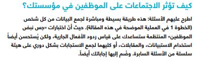 1- جمع البيانات من كل شخص: للحصول على رؤية أوضح عن كيف تؤثر الاجتماعات على مجموعتك، استخدم الاستبيانات أو المقابلات لجمع البيانات والانطباعات من كل فرد. حيث سيساعدك هذا على قياس المدى الكامل للمشكلة: ستعرف مقدار الاستياء المحتدم تحت السطح ومقدار العمل الذي لا ينجز خلال اليوم. (انظر الدليل المعنون "كيف تؤثر الاجتماعات على الموظفين في مؤسستك؟").