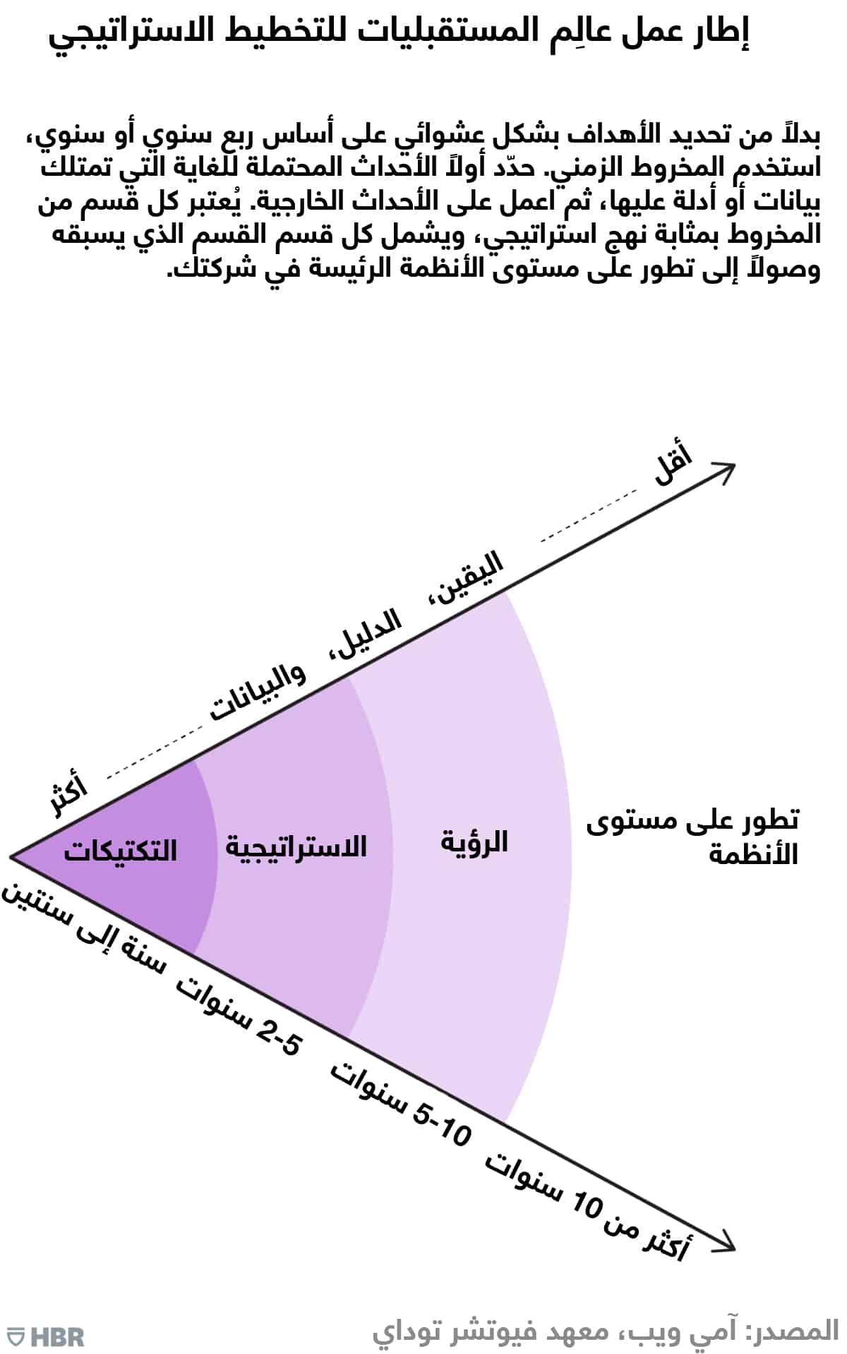 ولكن يجب أن تتوافق رؤية المؤسسة مع الفئة الأخيرة المتمثّلة بالزعزعة على مستوى الأنظمة التي من الممكن أن تتكشف في المستقبل البعيد. فإذا لم يمتلك القادة التنفيذيون إحساساً قوياً بكيفية تطور صناعتهم في سبيل مواجهة تحديات التكنولوجيا الجديدة وقوى السوق والتنظيمات وما شابه ذلك، فستظهر أمامهم شركة أخرى تملي عليهم شروط مستقبلهم. وتكون آفاق الوقت في نهاية المخروط واسعة للغاية، إذ من المستحيل حساب احتمال حصول هذه الأنواع من الأحداث. لذلك يجب أن تصف الإجراءات المتخذة الاتجاه الذي تأمل أن تتطور فيه المؤسسة واتجاه عملها.