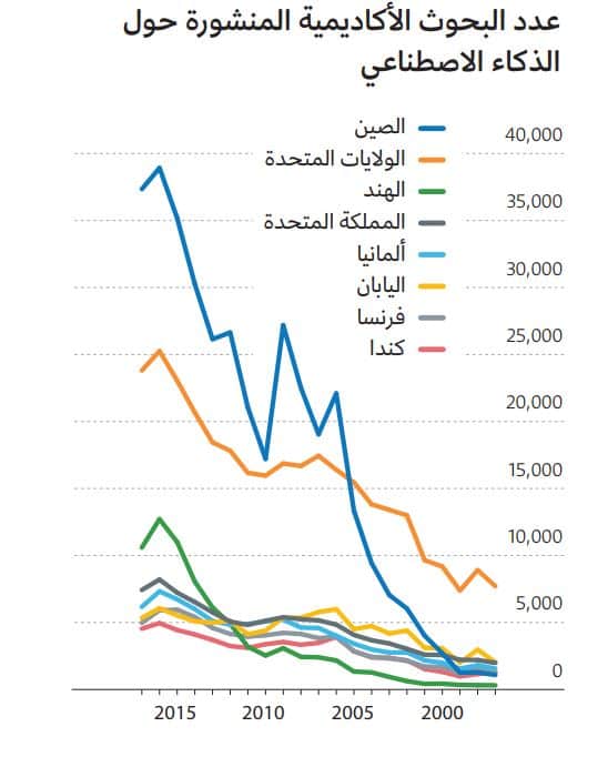 المصدر: تقرير صدر عام 2018 عن تطور الذكاء الاصطناعي في الصين، "المعهد الصيني لسياسات العلوم والتكنولوجيا" (China Institute for Science and Technology Policy) في "جامعة تشينغوا" (Tsinghua University) (بيانات)، أجرى التحليل ديشن لي (Daitian Li)، وتوني تونغ (Tony W. Tong)، ويانغاو شاو (Yangao Xiao).