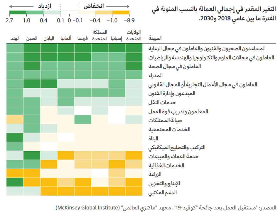أدت جائحة "كوفيد-19" إلى إبراز توجهات التوظيف التي كانت قيد التنفيذ بالفعل. يُظهر الرسم البياني أدناه تنبؤاً بالطلب على العمالة في العقد القادم بناءً على إحصاءات التوظيف على المستوى الوطني، مع مراعاة الأتمتة المتسارعة والتجارة الإلكترونية والعمل عن بُعد؛ وتناقص رحلات العمل؛ والمكاسب المتأتية من الناتج المحلي الإجمالي المتوقع ونمو الدخل؛ وشيخوخة السكان والتحولات الديموغرافية الأخرى.