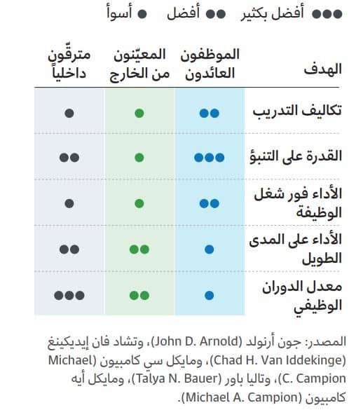 يمكن التنبؤ بأداء الموظفين العائدين إلى الشركة أكثر من أداء الموظفين الآخرين وقد ينخرطون في العمل بسرعة أكبر، ولكن تحليل أُجري عام 2019 لأكثر من 30 ألف عامل أميركي على مدار 8 سنوات أظهر أنه على الرغم من أنهم موظفون موثوقون، فإن أداءهم أضعف من أداء الموظفين المعيّنين من خارج الشركة والموظفين الذين تمت ترقيتهم داخل الشركة بعد عامهم الأول في العمل.