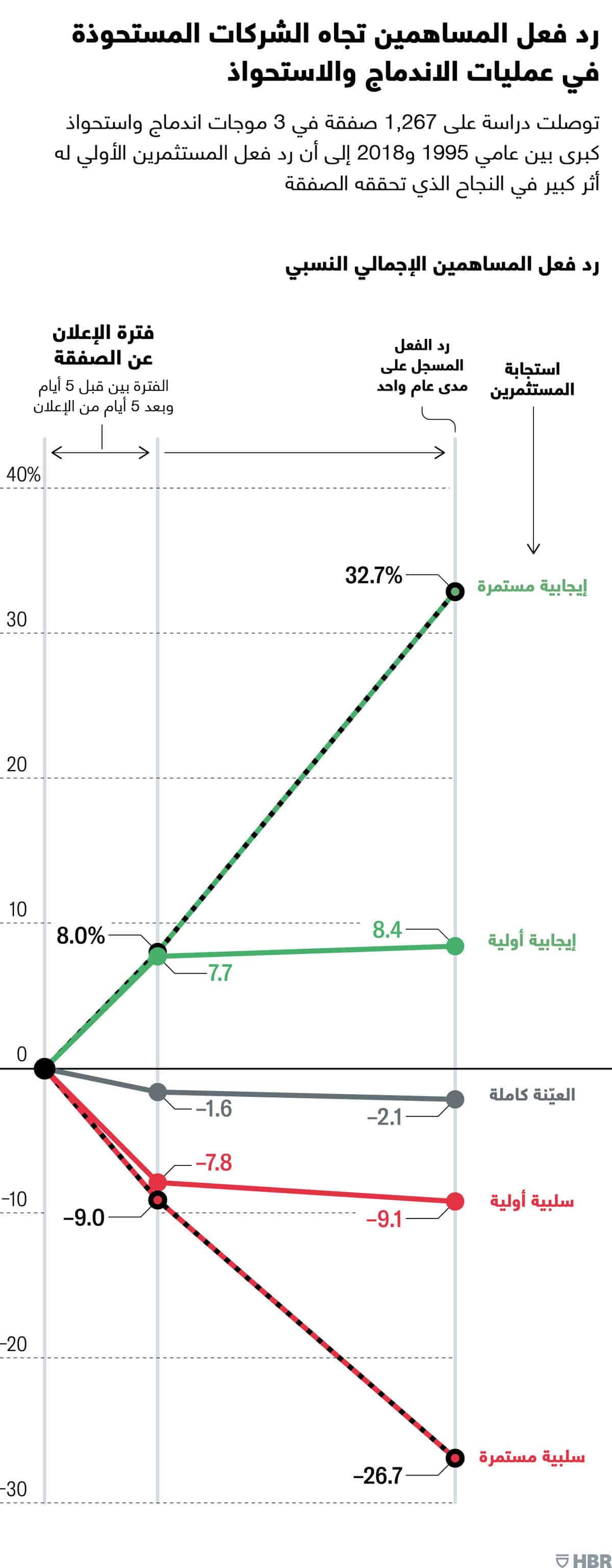 يكون مستوى أداء الشركات المستحوِذة أقل وسطياً من مستوى أداء الشركات القرينة في القطاع. في نتائج دراستنا التي تتوافق مع نتائج الكثير من الأبحاث الأكاديمية، تثبت البيانات أن 60% من الصفقات تلقى ردود فعل سلبية من المستثمرين و56% منها تكون نتائج إيراداتها على مدى العام التالي سلبية؛ أي إن هذه الاستثمارات الرأسمالية الكبيرة أقرب إلى الفشل منها إلى النجاح.