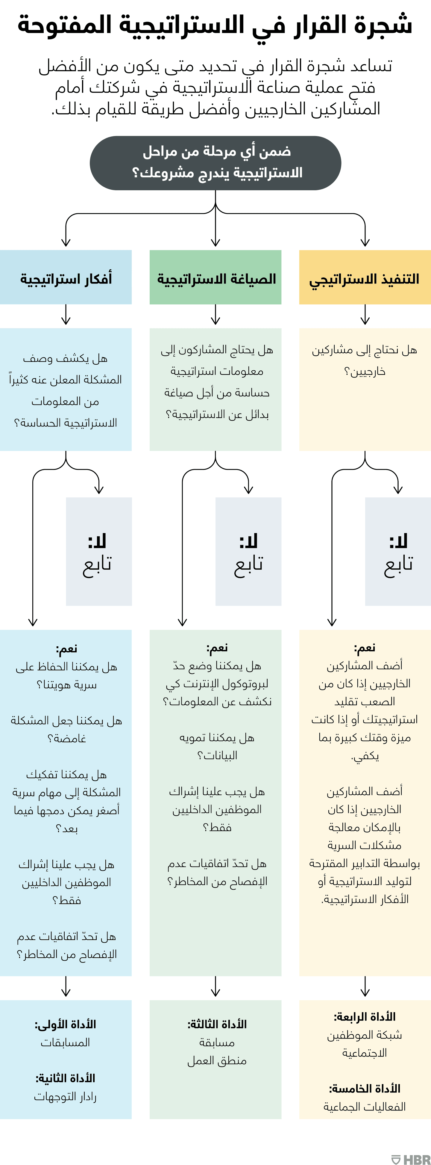 كما هو موضح في صورة "شجرة القرار في الاستراتيجية المفتوحة" أعلاه، طورنا إطار عمل لمساعدة المدراء في كل مرحلة من مراحل صنع الاستراتيجية الثلاث على تحديد (1) ضرورة أن يكون المشاركون من داخل الشركة أو ضم مشاركين خارجيين إليهم و(2) ضرورة توظيف مجموعات كبيرة من الموظفين المختارين على نحو عشوائي أو الذين اختاروا أنفسهم أو استهداف أعداد صغيرة من أفراد يتم اختيارهم بعناية. في كل حالة نحدد آليات الاستراتيجية المفتوحة الملائمة للتفاعل مع المشاركين الخارجيين، وهي تتضمن: