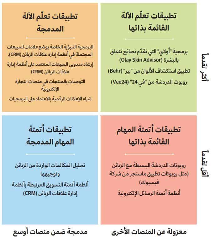 الجمع بين نمطي الذكاء ونمطي البنية هذين يُنتج الأقسام الأربعة للإطار: تطبيقات تعلّم الآلة القائمة بذاتها، وتطبيقات تعلّم الآلة المدمجة، والتطبيقات القائمة بذاتها لأتمتة المهام، والتطبيقات المدمجة لأتمتة المهام. (للمزيد من المعلومات راجع الفقرة الجانبية بعنوان "الأنواع الأربعة للتسويق باستعمال الذكاء الاصطناعي").