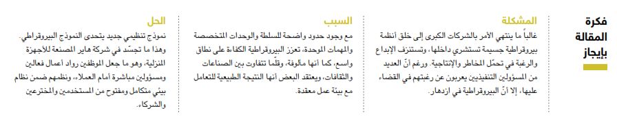 هناك سبب يجعل الشركات الجديدة تتفوق على الشركات الكبرى مراراً وتكراراً، وهو أنّ البيروقراطية متحفظة في جوهرها. ويعبّر لورانس بيتر، مؤلف كتاب "مبدأ بيتر" عن ذلك بقوله: "تدافع البيروقراطية عن "الوضع الراهن" منذ زمن طويل، لدرجة أن يفقد الأمر الواقع مكانته". ومن أجل مواجهة هذا التقديس لما هو قائم، أنشأت العديد من الشركات مراكزاً خارجية في وادي السليكون وغيرها من المناطق الساخنة التي تعزز الابتكار.