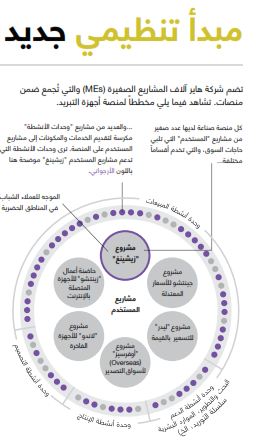 لدى شركة هاير منهج مختلف، فهي تنظم جميع مشاريعها ضمن منصات. وتجمع بعض المنصات بين المشاريع التي تعمل ضمن فئة مشابهة، مثل المنتجات الخاصة بأجهزة التنظيف أو المنتجات السمعية البصرية. بينما يركز بعضها الآخر على بناء كفاءات جديدة، مثل التسويق الرقمي والتخصيص الشامل. وتضم منصة الصناعة النموذجية أكثر من 50 مشروعاً صغيراً، (انظر إلى مخطط "مبدأ تنظيمي جديد" لصورة مأخوذة لإحدى اللقطات).