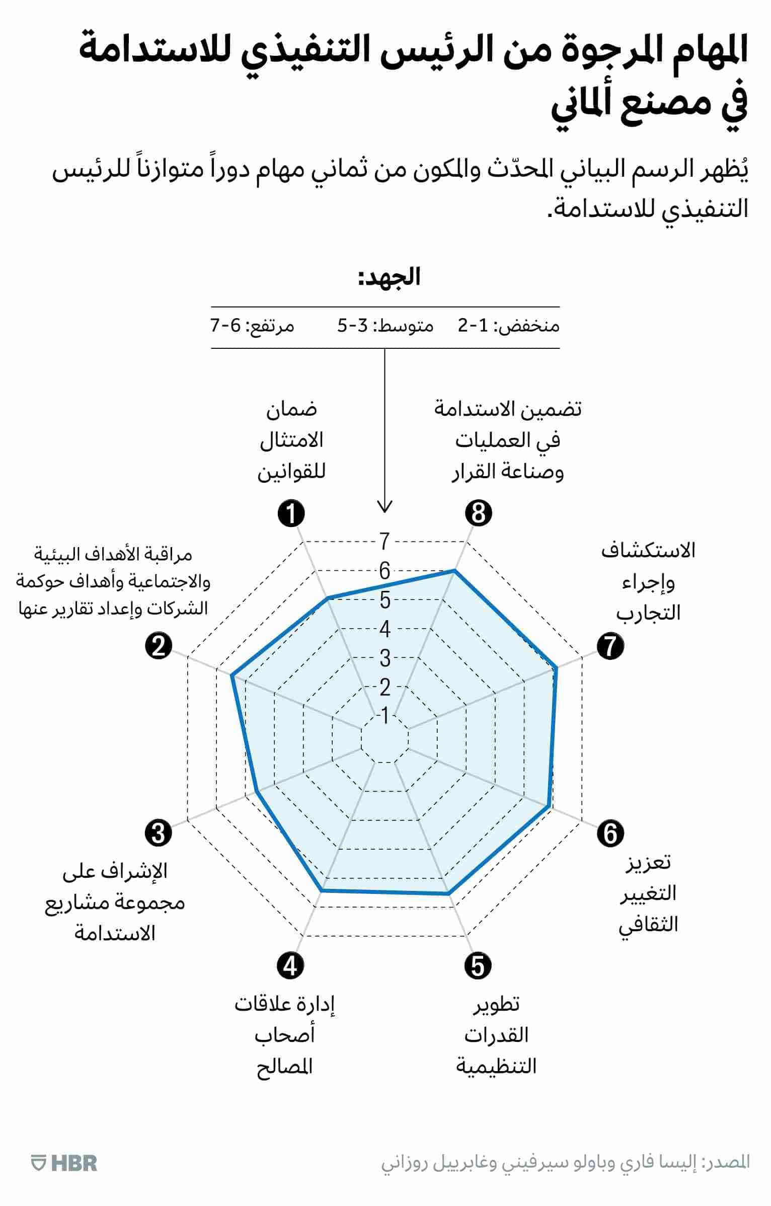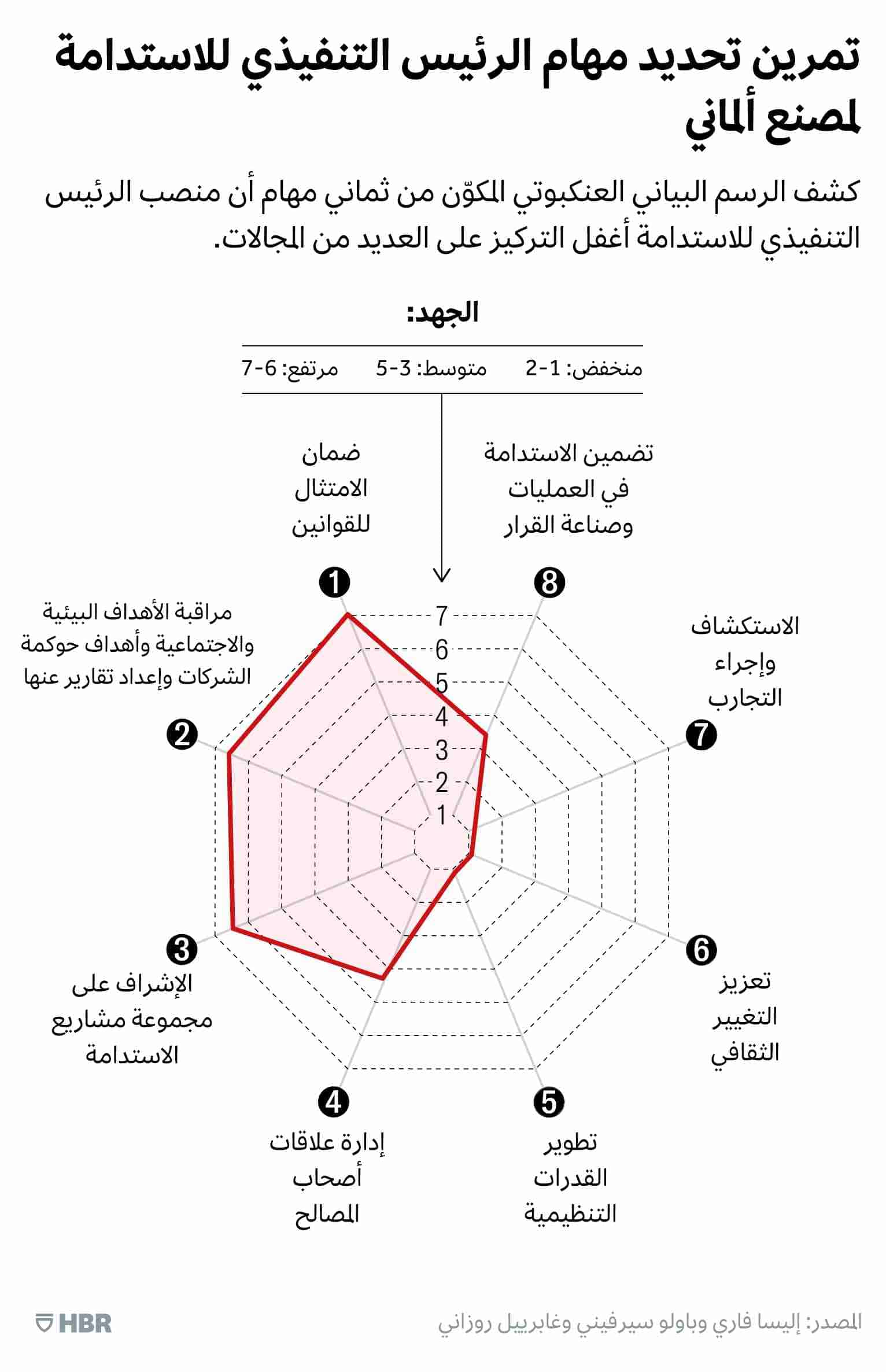 عندما عملنا مع شركة تصنيع ألمانية، طرح المسؤول التنفيذي العديد من الأسئلة حول التفاصيل التنظيمية والإجراءات المحددة، لكن سرعان ما تبيّن لنا أنهم يفتقرون إلى التركيز والتفكير الاستراتيجي حول "ماهية" منصب الرئيس التنفيذي للاستدامة و"أهميته"، فشجعناهم على إزالة الغموض من خلال إعداد رسم بياني عنكبوتي يضمّ 8 مهام خلال ورشة عمل تنفيذية قبل الانتقال إلى ديناميكيات التصميم التنظيمي.