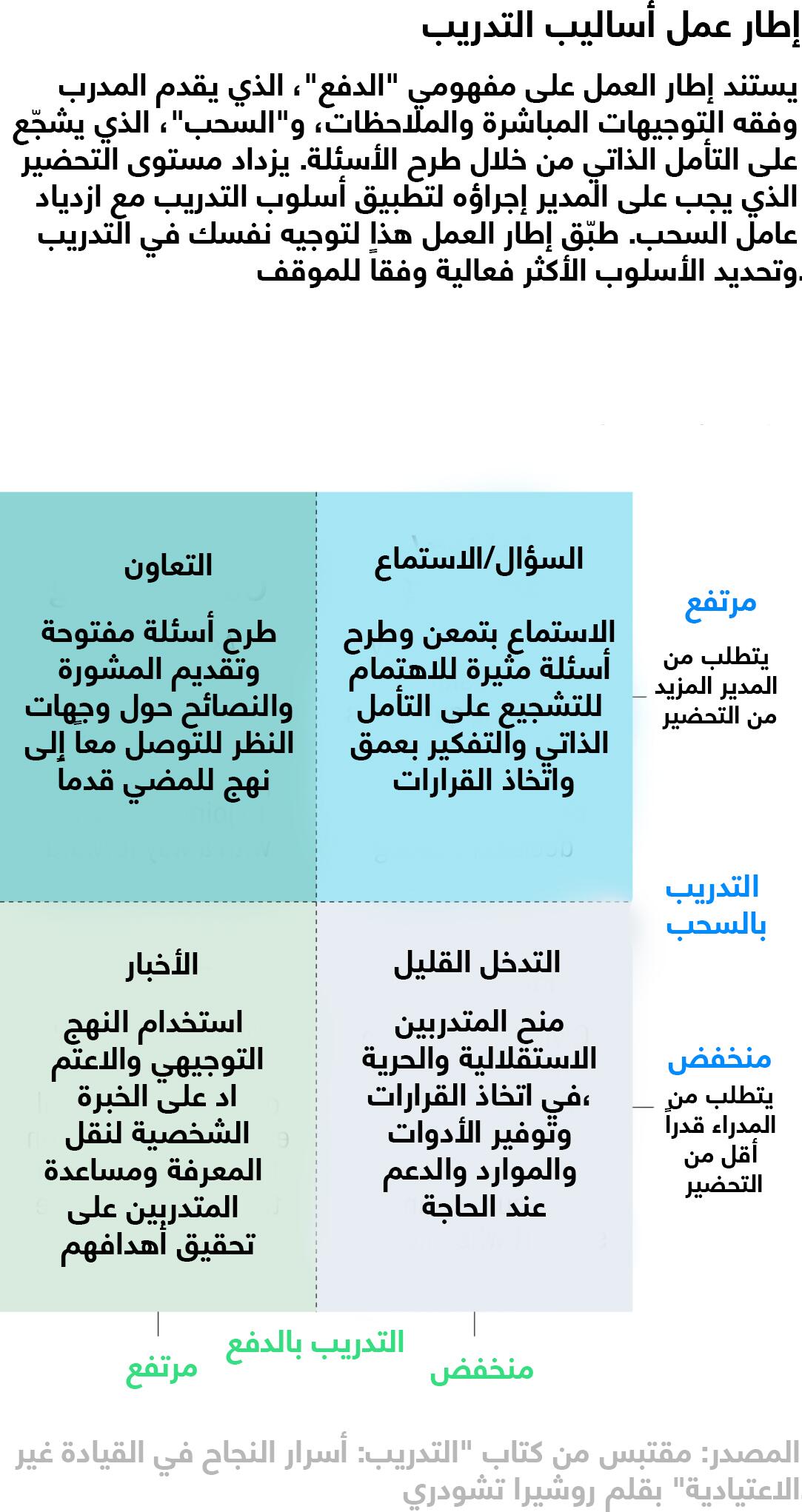 قد يكون تحديد أسلوب التدريب المناسب مرهقاً للمدراء الجدد والمتمرسين على حد سواء، ويتطلب فهم الكثير من الأمور. لهذا السبب، صممت إطار عمل لتعليم التدريب للمدراء. يعتمد هذا الإطار، الذي أطلقت عليه اسم "أساليب التدريب"، على البحث الذي أجريته عند تأليف كتابي، الذي تضمن مقابلات مع أكثر من 100 قائد من مختلف الفئات العمرية والقطاعات ومجالات العمل ومستويات الخبرة، ودراسة أطر عمل أخرى للتدريب مثل طيف التدريب الذي صممه مايلز داوني، ومراجعة عميقة للأدبيات الأكاديمية حول هذا الموضوع.